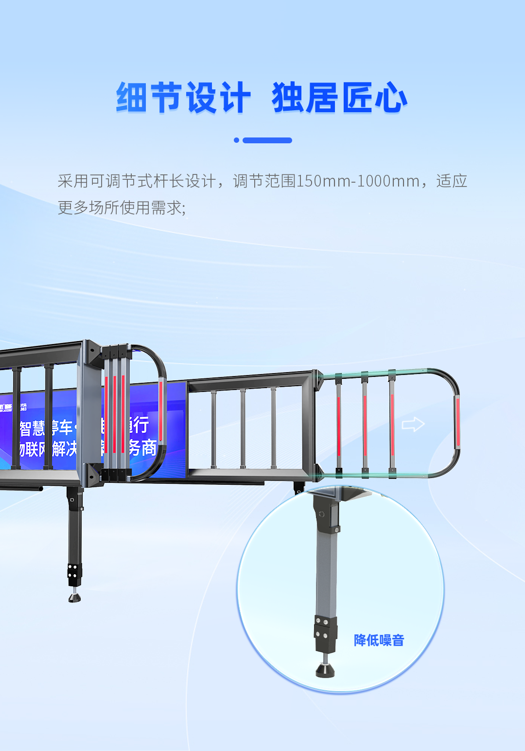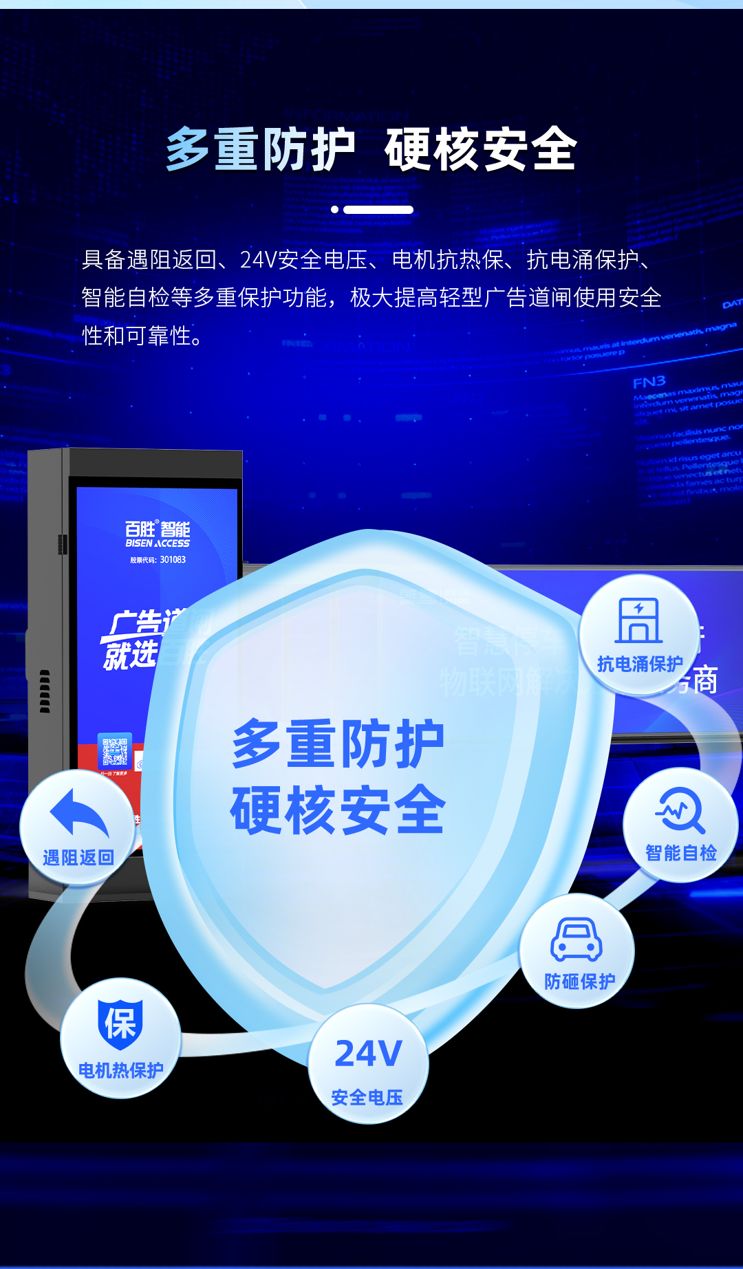 具備遇阻返回、24V安全電壓、電機(jī)抗熱保、抗電涌保護(hù)智能自檢等多重保護(hù)功能,極大提高輕型廣告道閘使用安全性和可靠性。